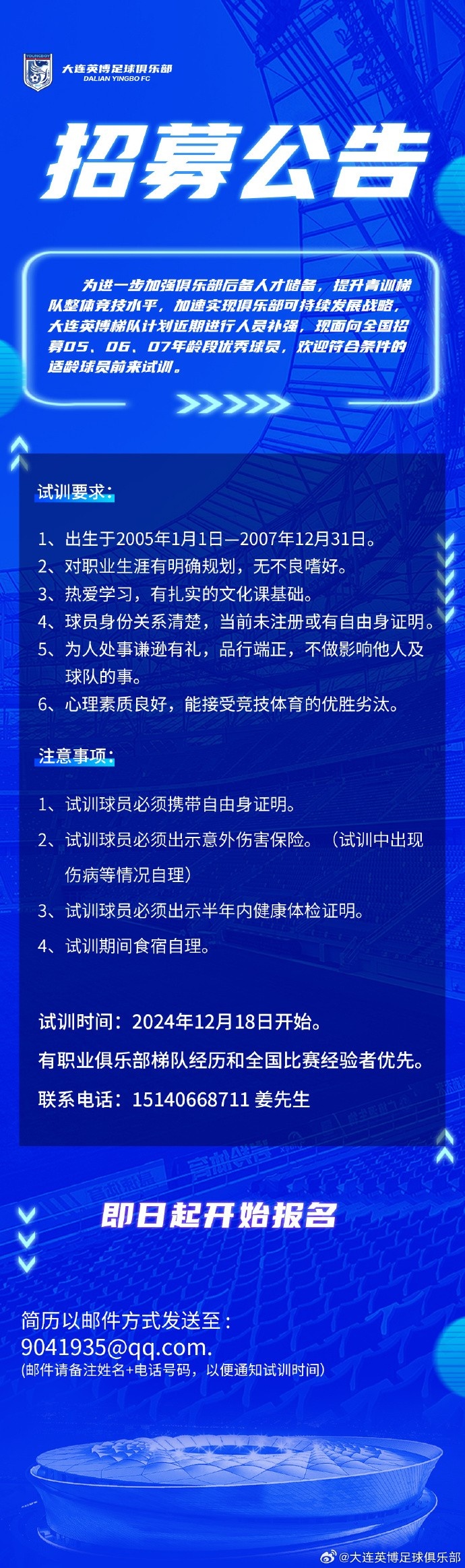 大连英博官方写道,为进一步加强俱乐部后备人才储备,提升青训梯队整体竞技水平,加速实现俱乐部可持续发展战略,大连英博梯队计划近期进行人员补强,现面向全国招募05、06、07年龄段优秀球员,欢迎符合条件的适龄球员前来试训。